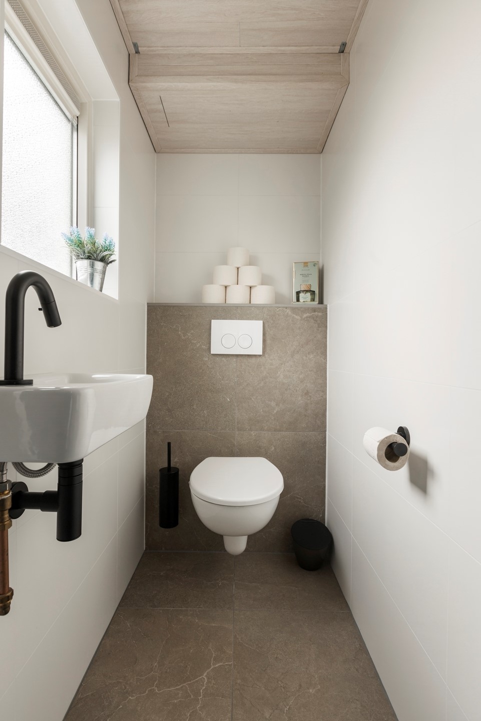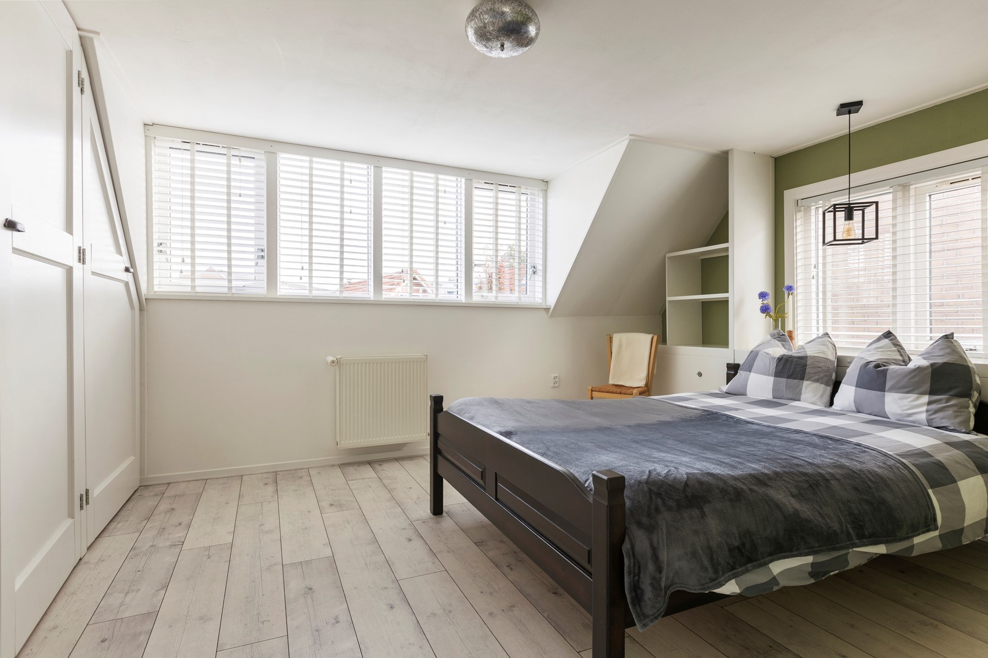 Via de hal bij de voordeur leidt de trap naar de eerste verdieping met twee slaapkamers van circa 13 m² en 4 m², beide voorzien van handige inbouwkasten. Op deze verdieping bevindt zich tevens een tweede toilet met wastafel. Vanuit de overloop is er toegang tot het platte dak. Ook beschikt de woning over een vliering, voor nog meer bergruimte.