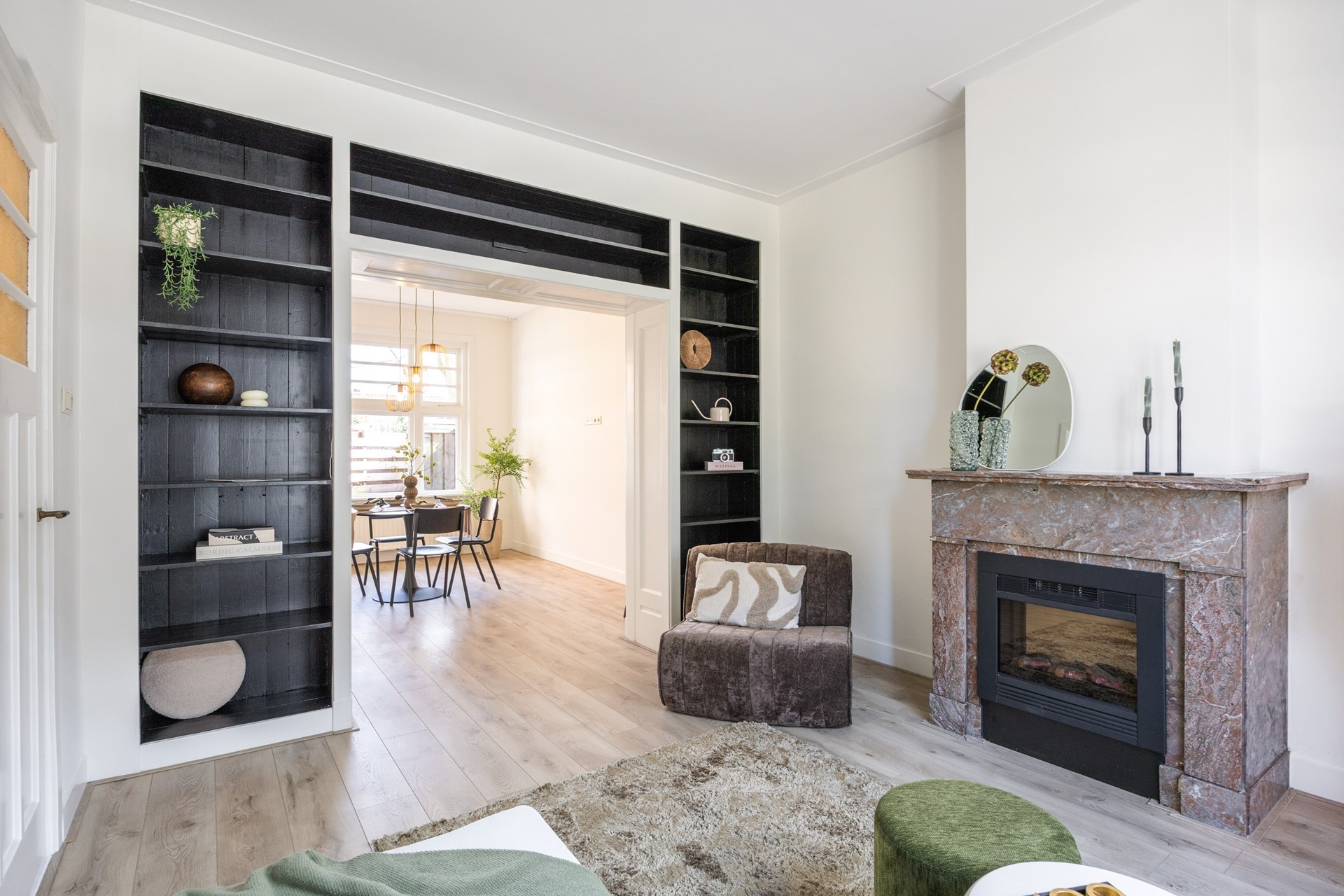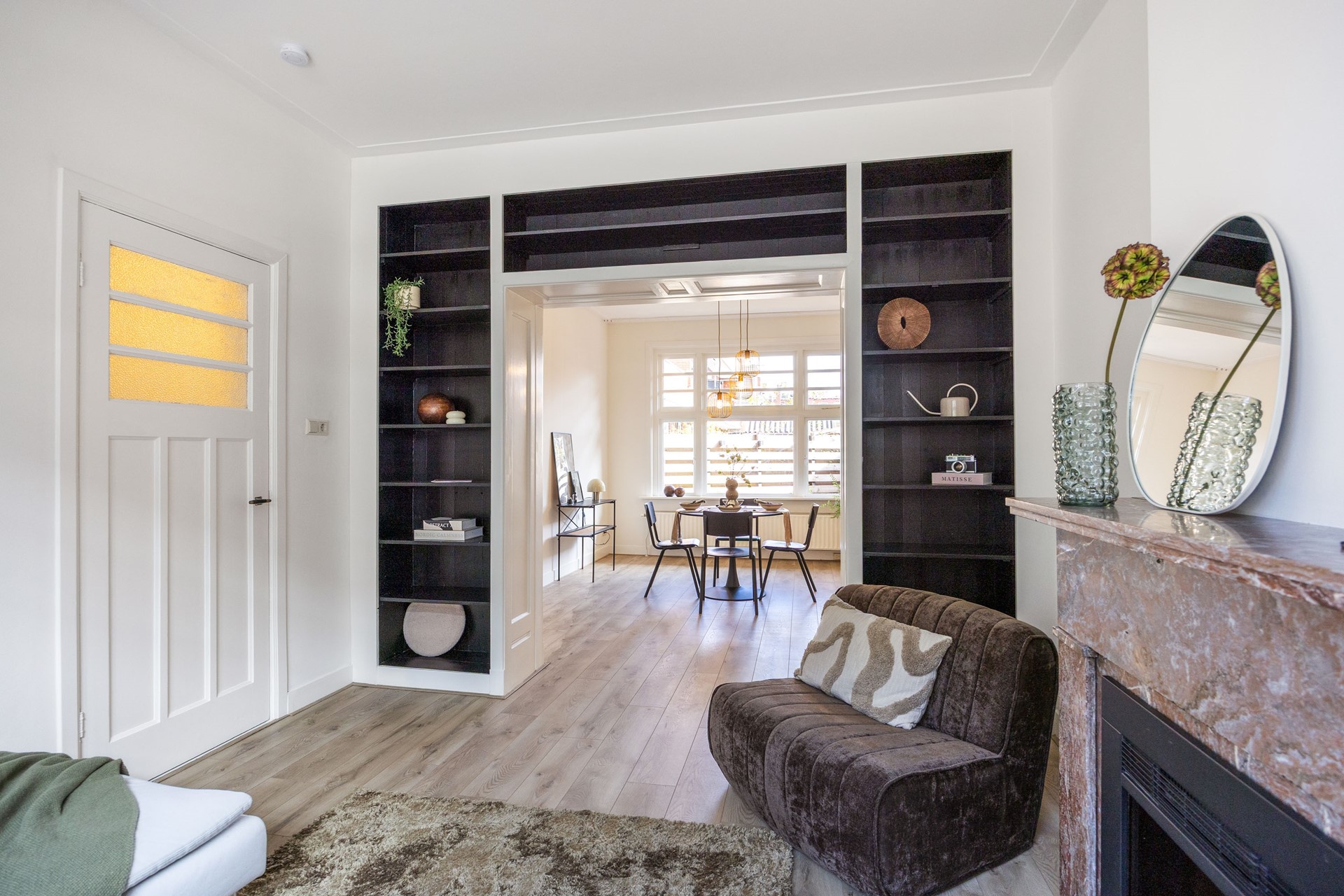 Via de voordeur kom je in de hal, die toegang geeft tot alle ruimtes in huis. Aan de rechterkant ligt de ruime woonkamer van circa 29 m² met veel lichtinval. Het woongedeelte heeft een sfeervolle schouw met gaskachel. De kasten in het midden zorgen voor extra bergruimte en brengen een fijne scheiding aan tussen het woon- en eetgedeelte.