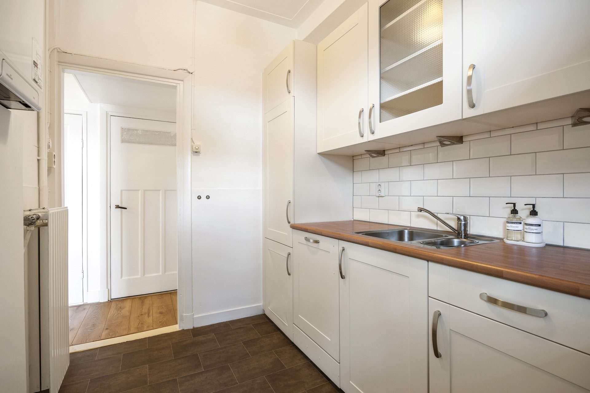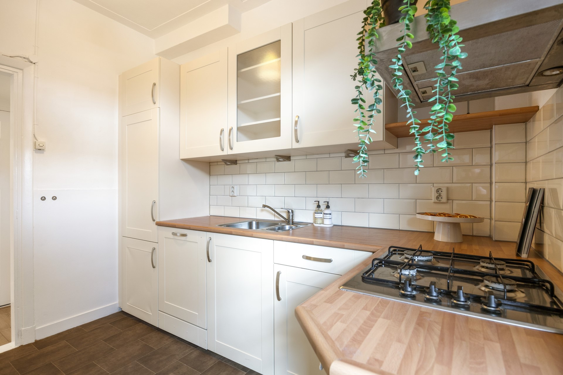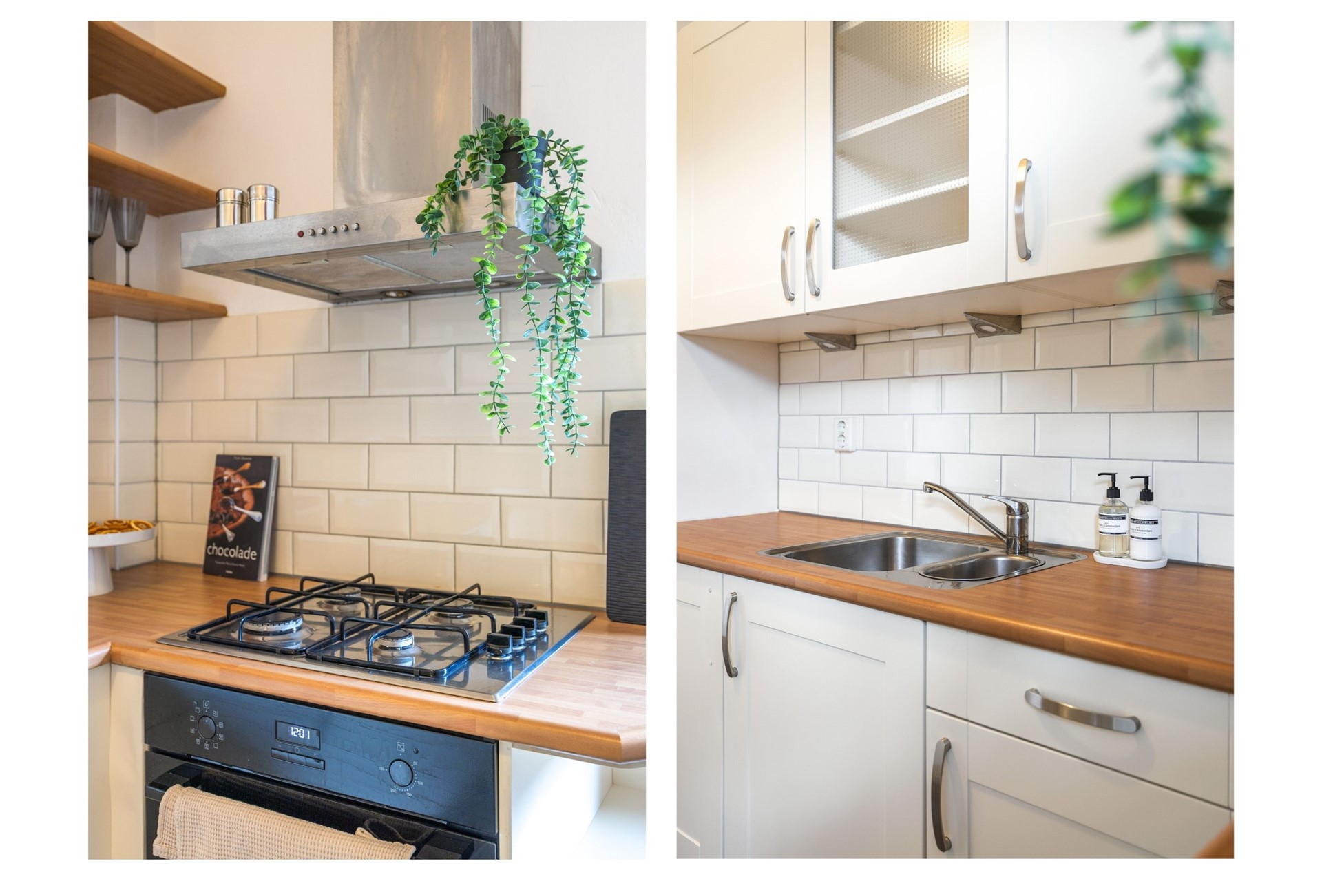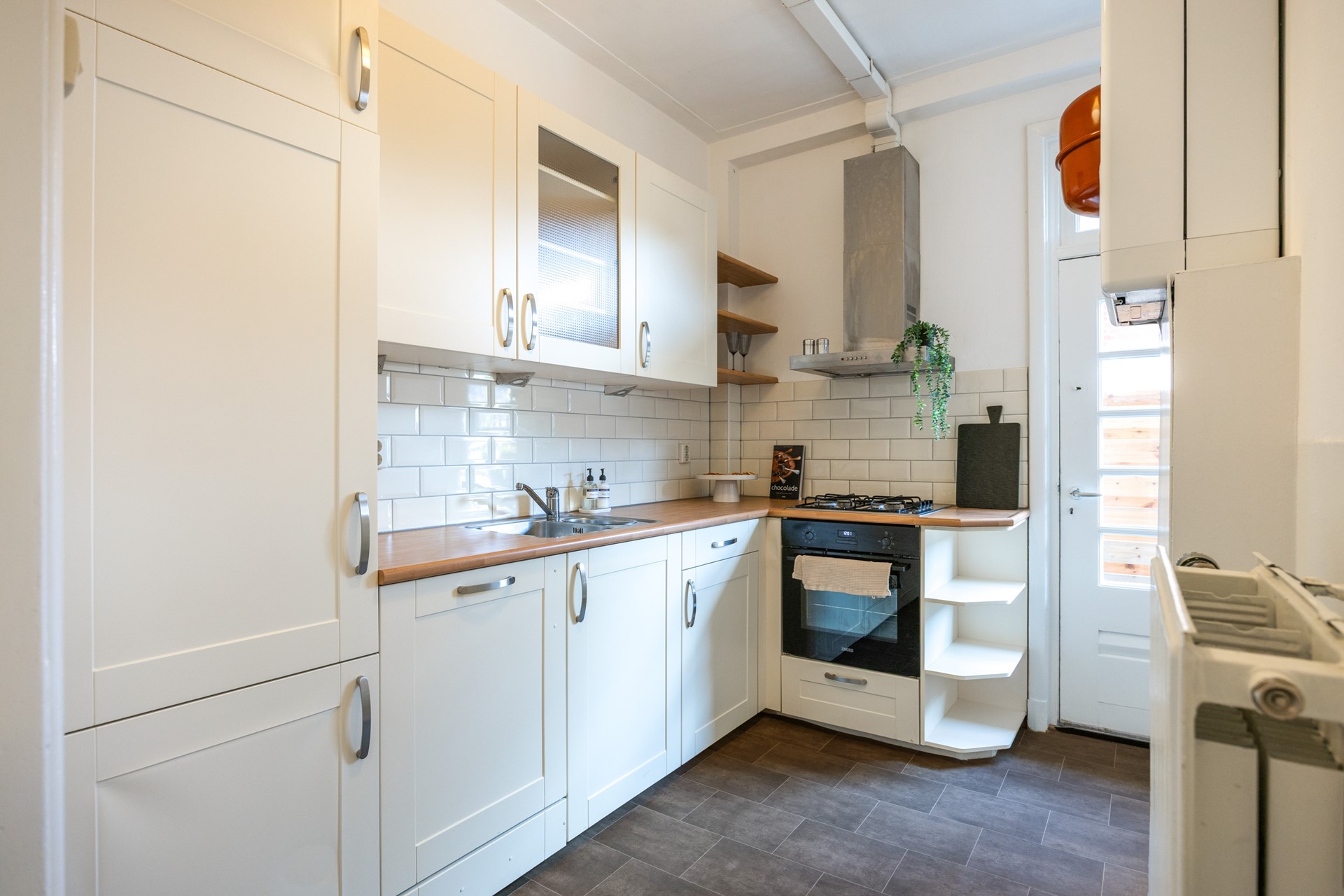 De keuken is netjes afgewerkt en voorzien van inbouwapparatuur, zoals een oven (2024), gaskookplaat, afzuigkap, vaatwasser (2024) en een ingebouwde koelkast en vriezer. Vanuit de keuken stap je zo de tuin in.