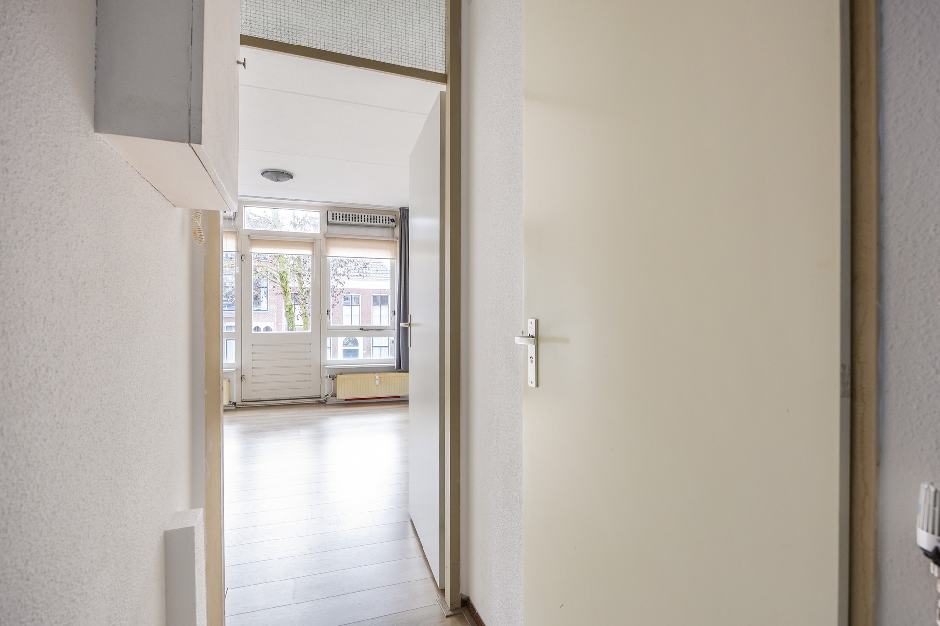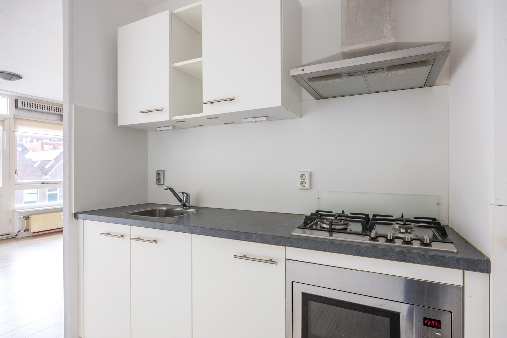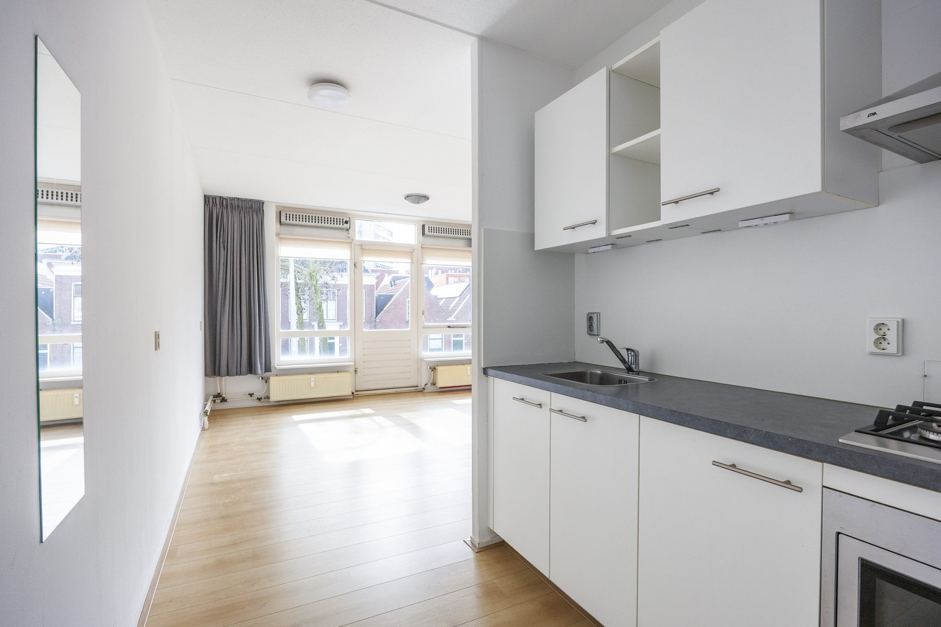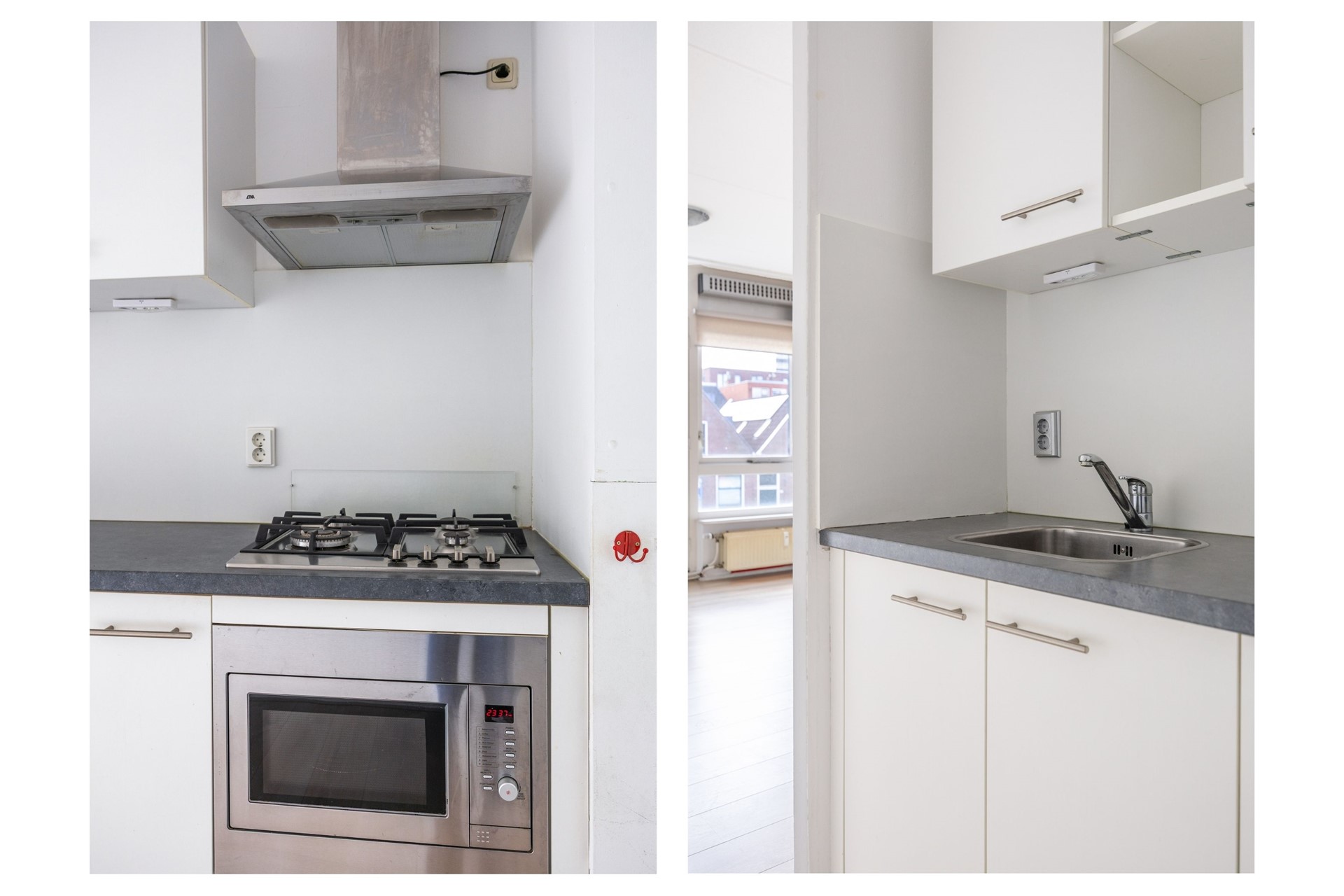 Het appartement ligt op de eerste verdieping en is bereikbaar via de trap in het afgesloten portiek. Je komt binnen in de hal, die toegang geeft tot het woon-/slaapgedeelte aan de voorzijde met open keuken. De keuken is netjes afgewerkt en voorzien van inbouwapparatuur, waaronder een gaskookplaat, combi-oven/magnetron en afzuigkap. De ruimte heeft een oppervlakte van circa 24 m².