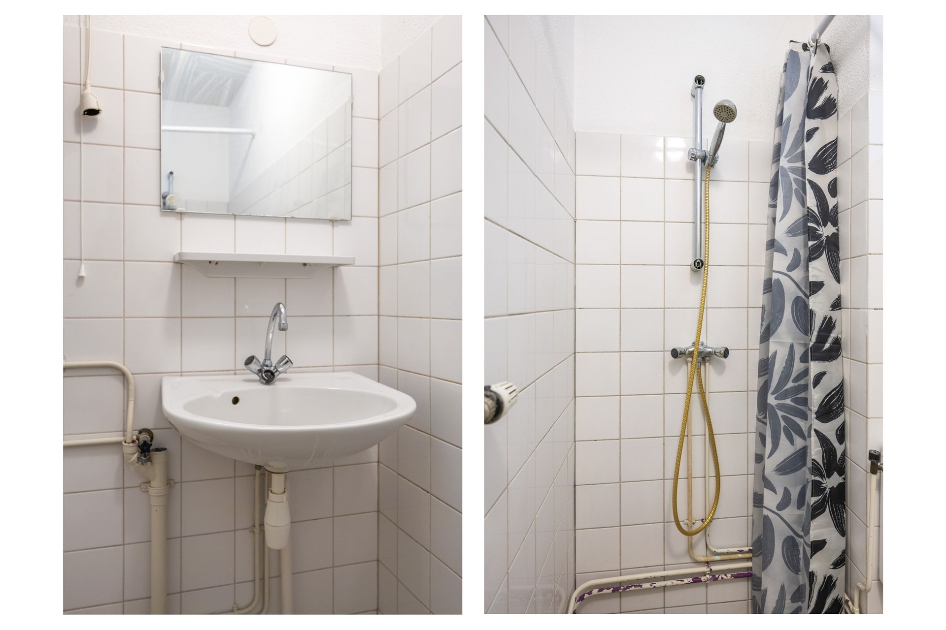 Vanuit de hal bereik je ook de badkamer, die is uitgerust met een toilet, wastafel en douche. Ook de wasmachineaansluitingen bevinden zich in de badkamer. Daarnaast is er een praktische bergkast van ongeveer 1 m², gelegen buiten de woning bij de voordeur en ideaal voor extra opslag.