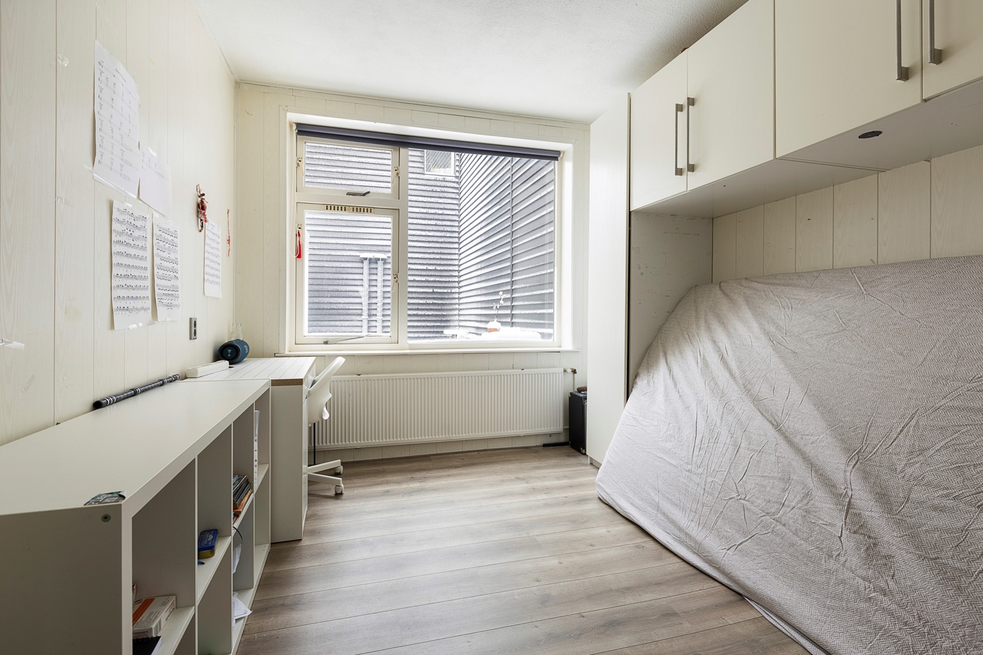 Vanuit de hal is ook de berging bereikbaar, met aansluitingen voor de wasmachine. De badkamer is praktisch ingedeeld en beschikt over een inloopdouche, toilet en wastafel. Aan de achterzijde van de woning ligt de ruime slaapkamer van ca. 12 m².