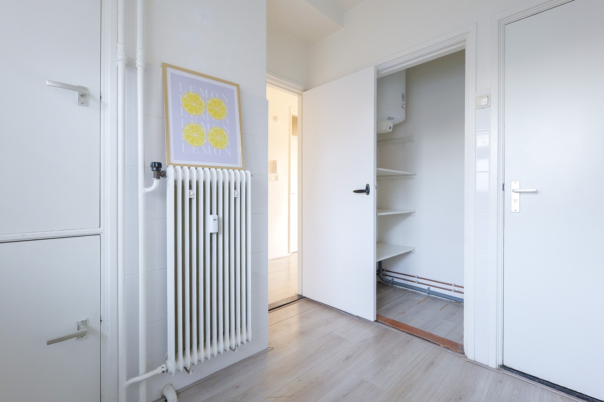 De woning ligt op de eerste verdieping van de Julianaflat. Via de afgesloten centrale hal bereik je het appartement met de trap of lift. Bij binnenkomst kom je in de hal. Aan de rechterzijde bevindt zich de nette, afgesloten keuken van circa 6 m², voorzien van onder andere een gaskookplaat en afzuigkap. Vanuit de keuken is de badkamer bereikbaar, met een inloopdouche en wastafel.