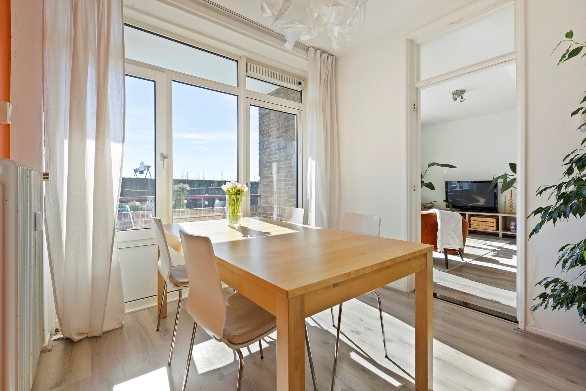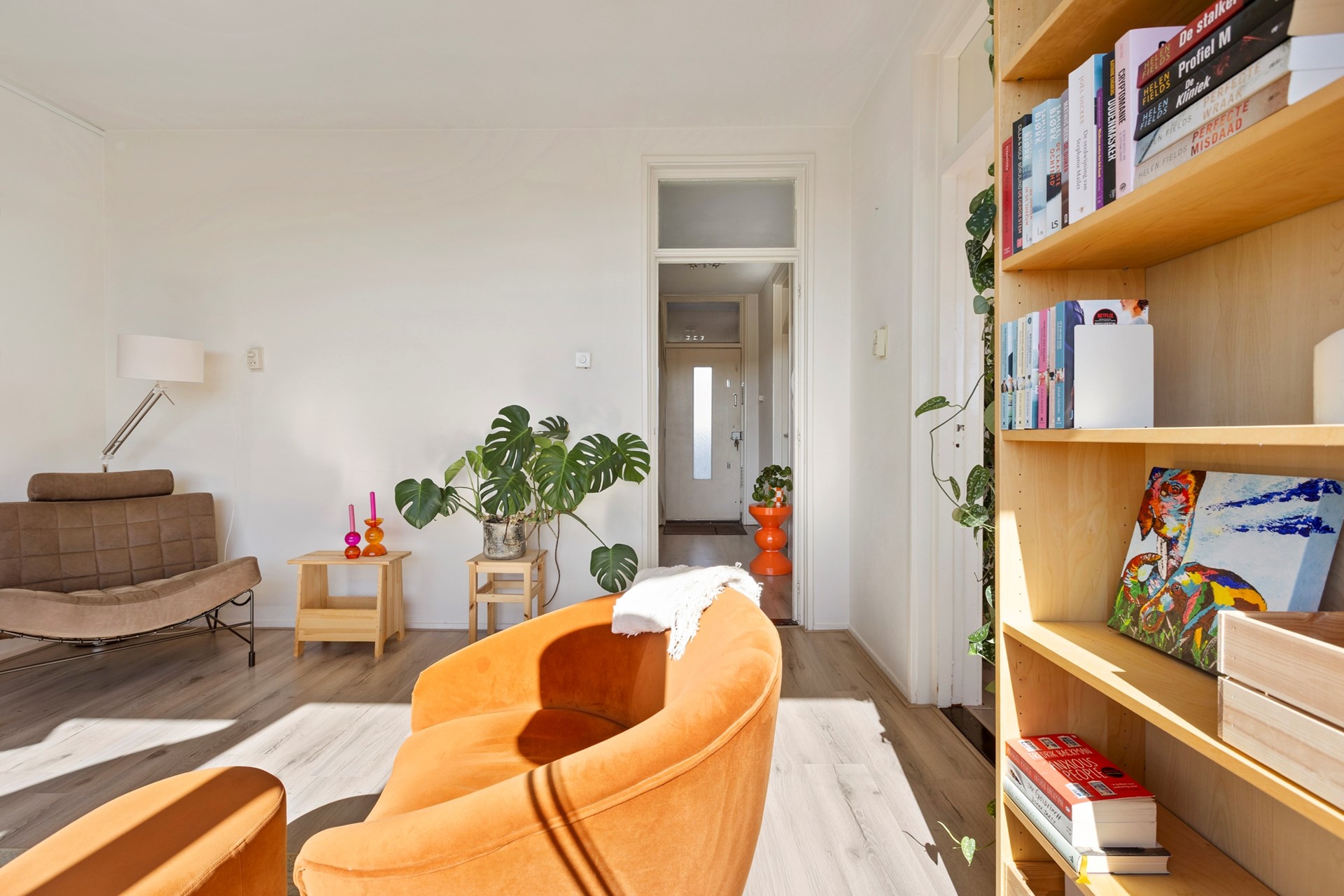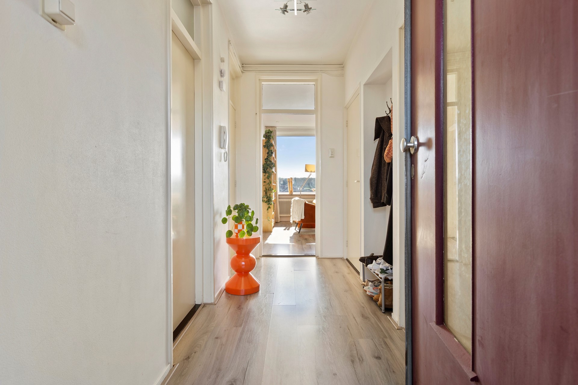 De woning bevindt zich op de derde etage en is via de trap in de centrale hal te bereiken. Bij binnenkomst sta je in de hal, met aan de voorzijde de lichte woonkamer van 18 m². Aangrenzend aan deze kamer zit een een kamer van ca. 9 m² die nu is ingericht als eetkamer maar ook als slaapkamer gebruikt kan worden. Hier bevinden zich twee inbouwkasten. Vanuit deze kamer is het balkon te bereiken, dat gelegen is op het zuiden: een fijne plek om tot in de late uurtjes van de zon te genieten.