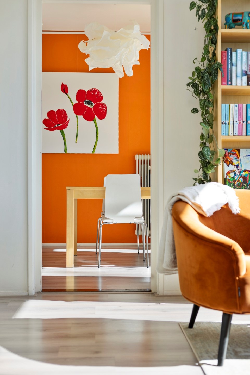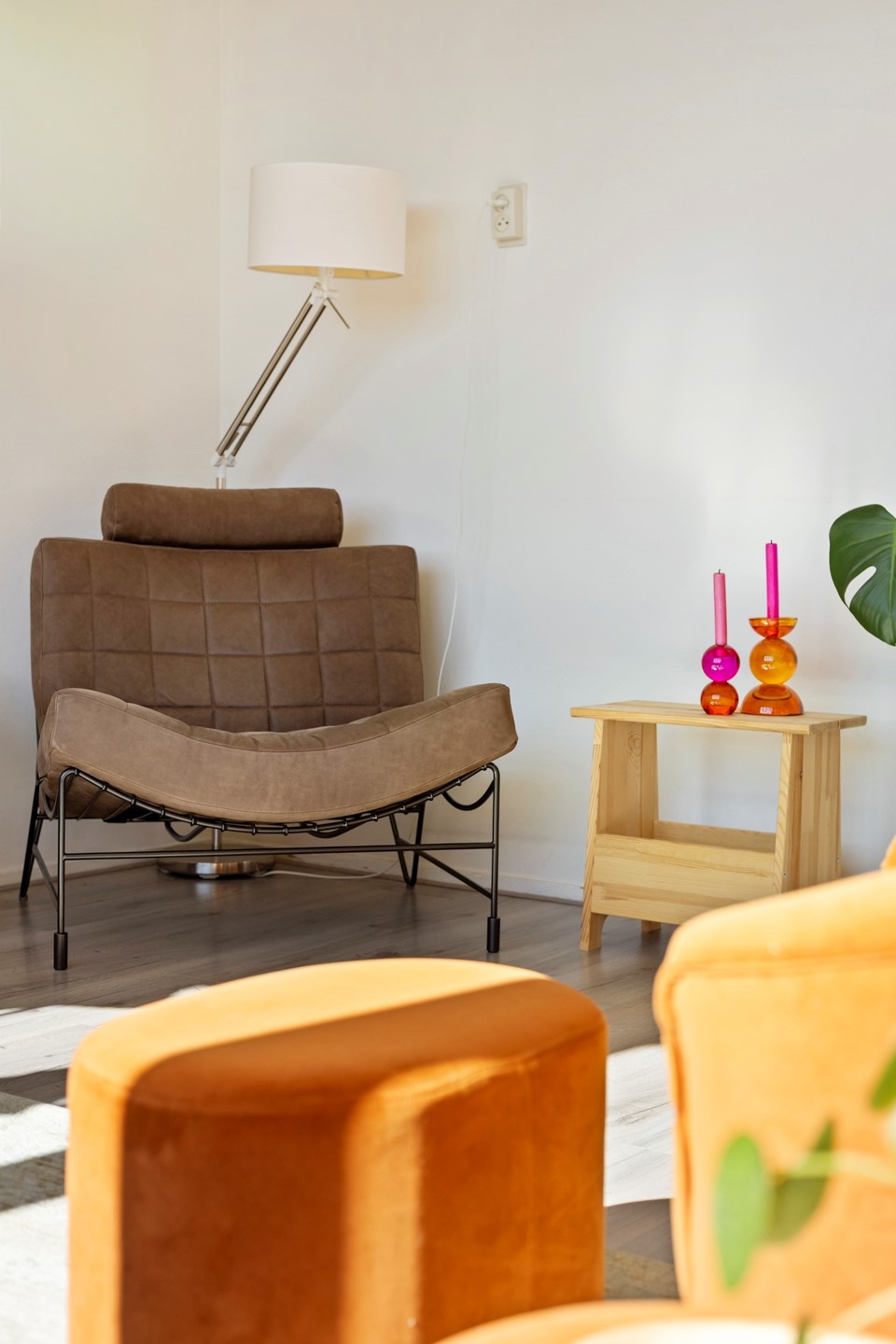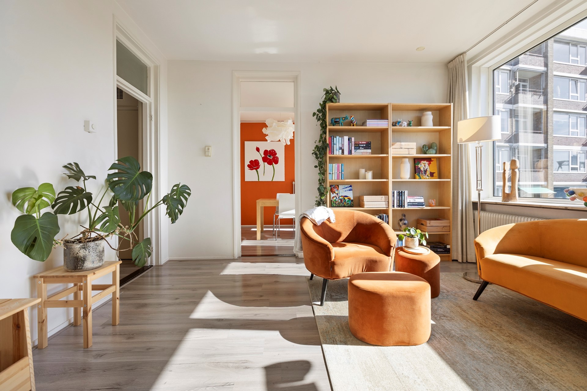 De woning bevindt zich op de derde etage en is via de trap in de centrale hal te bereiken. Bij binnenkomst sta je in de hal, met aan de voorzijde de lichte woonkamer van 18 m². Aangrenzend aan deze kamer zit een een kamer van ca. 9 m² die nu is ingericht als eetkamer maar ook als slaapkamer gebruikt kan worden. Hier bevinden zich twee inbouwkasten. Vanuit deze kamer is het balkon te bereiken, dat gelegen is op het zuiden: een fijne plek om tot in de late uurtjes van de zon te genieten.