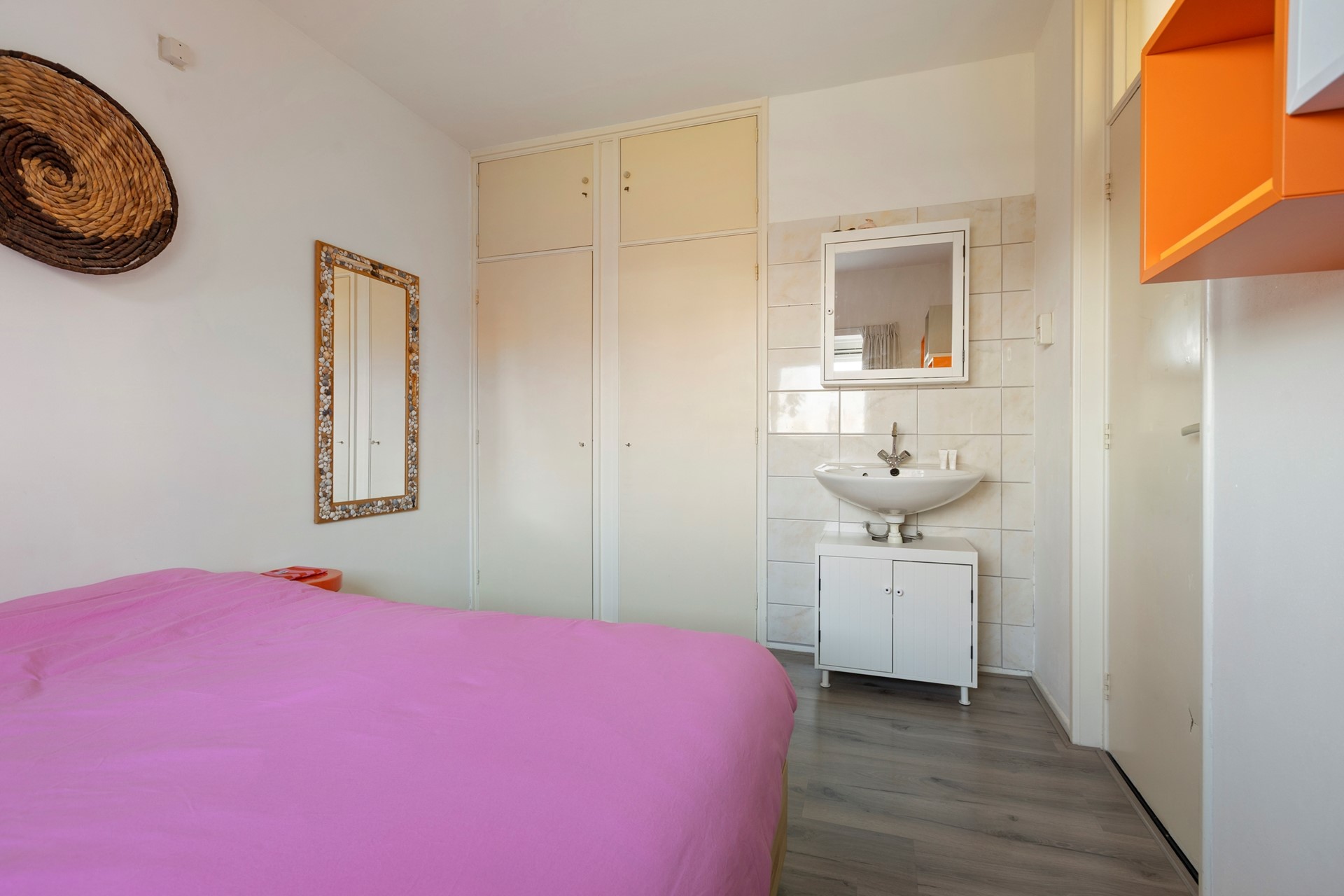 Via de hal komt je in de slaapkamer van circa 10 m² met twee inbouwkasten en een wastafel. Vanuit de hal is het toilet te bereiken, met daartegenover een grote bergkast die beschikt over de wasmachineaansluitingen.