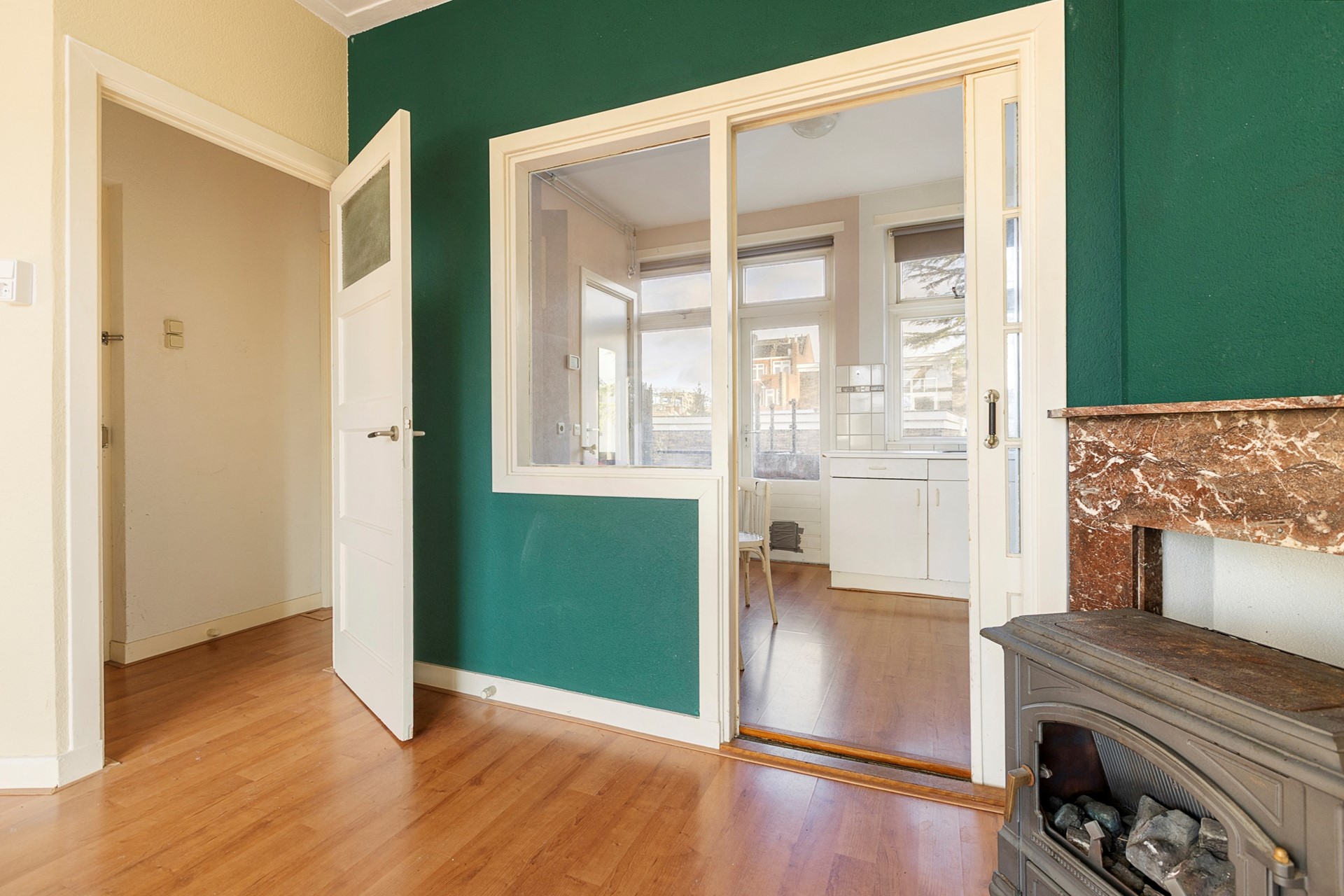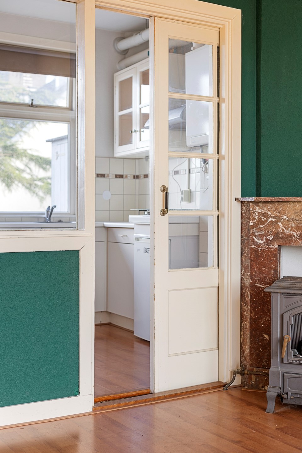 De woning ligt op de eerste verdieping en is bereikbaar via een trap naar de voordeur. Vanuit de hal heb je toegang tot de woon-/slaapkamer met prachtig uitzicht over het groen en het spoor. De woon-/slaapkamer is ongeveer 15 m² groot en heeft een erker, ideaal voor een knus zithoekje. Via en-suite deuren kom je in de circa 9 m² grote keuken. Deze is praktisch ingericht en voorzien van onder andere een gaskookplaat en afzuigkap. Ook bevinden zich hier de wasmachineaansluitingen. Vanuit de keuken bereik je de badkamer, die is uitgerust met een douche en een wastafel. Het toilet is te bereiken vanuit de hal. Daarnaast beschikt de woning over een ruim balkon van circa 9 m².