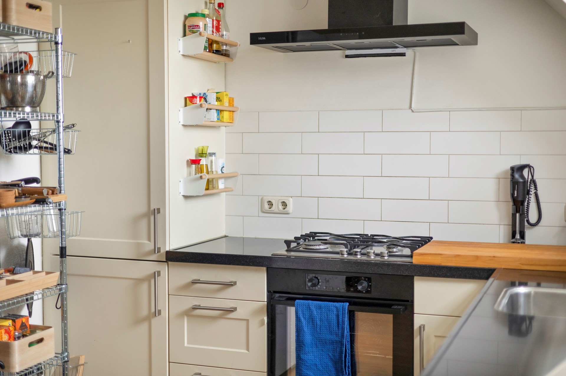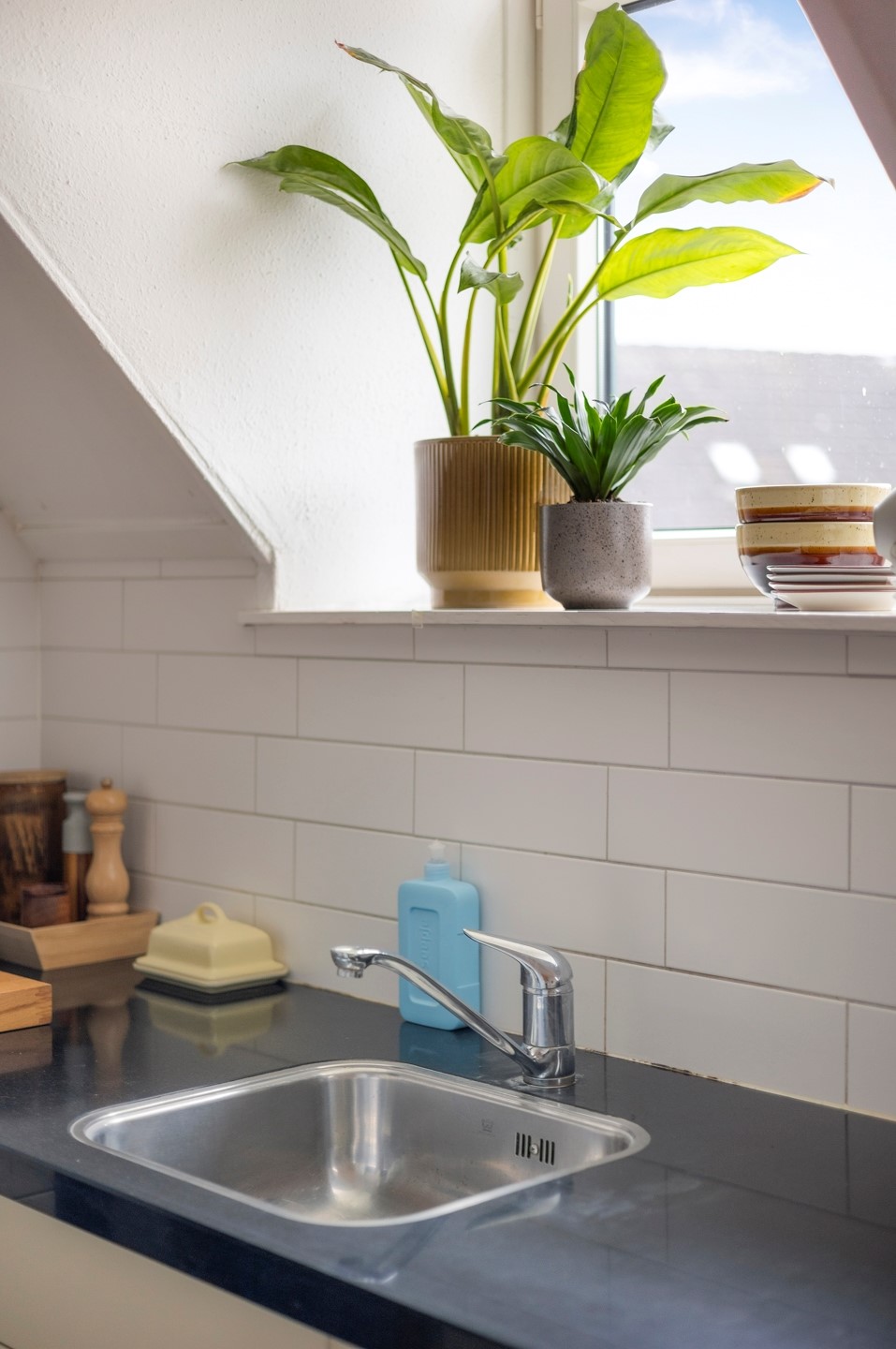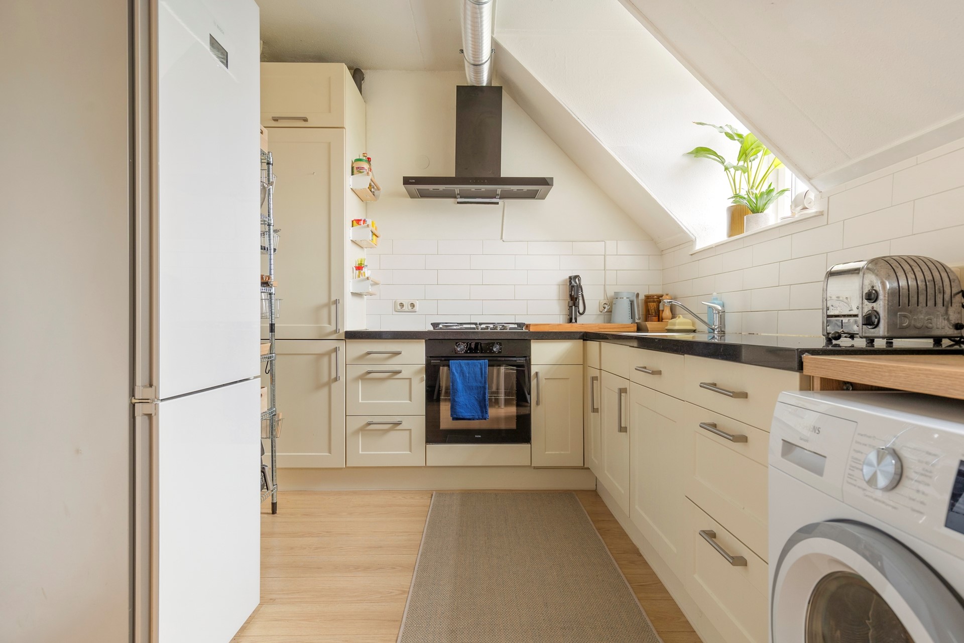 De ruime woonkeuken is licht en biedt ook nog eens ruimte voor een tweede eethoek of bijvoorbeeld een werkplek. De keuken is uitgerust met diverse inbouwapparatuur, waaronder een oven, vaatwasser, gaskookplaat en afzuigkap. Een fijne plek om te koken! Ook bevinden zich hier de aansluitingen voor de wasmachine.