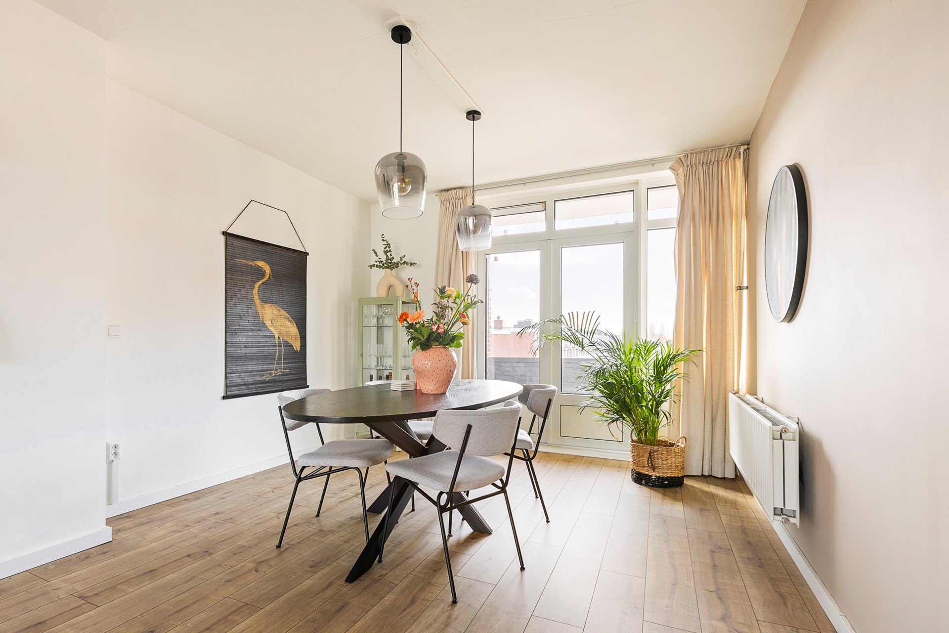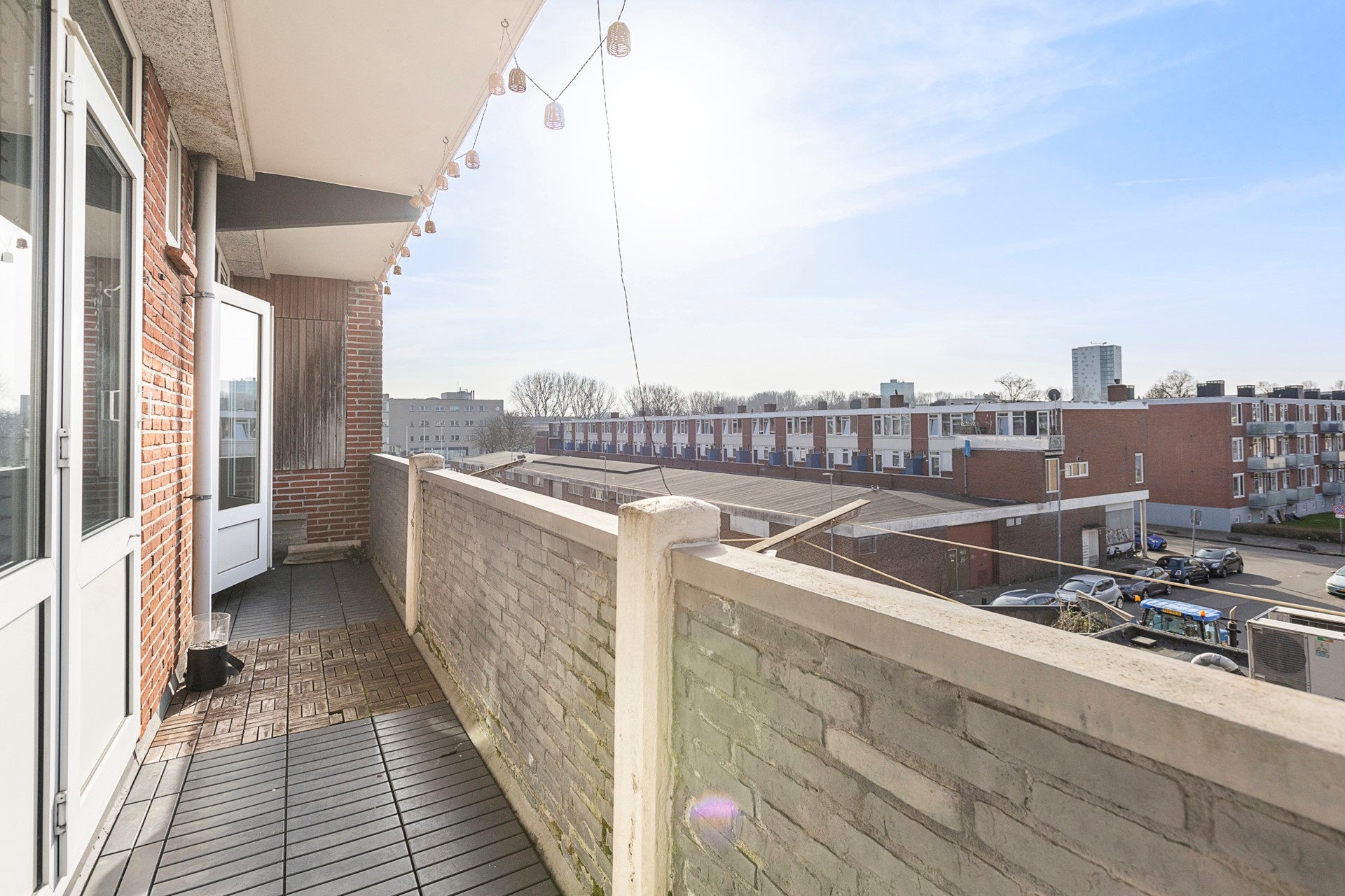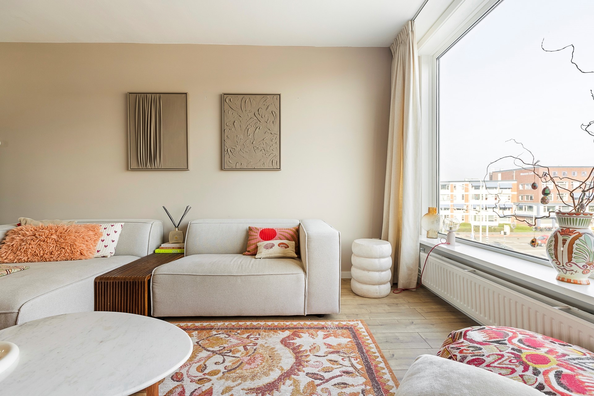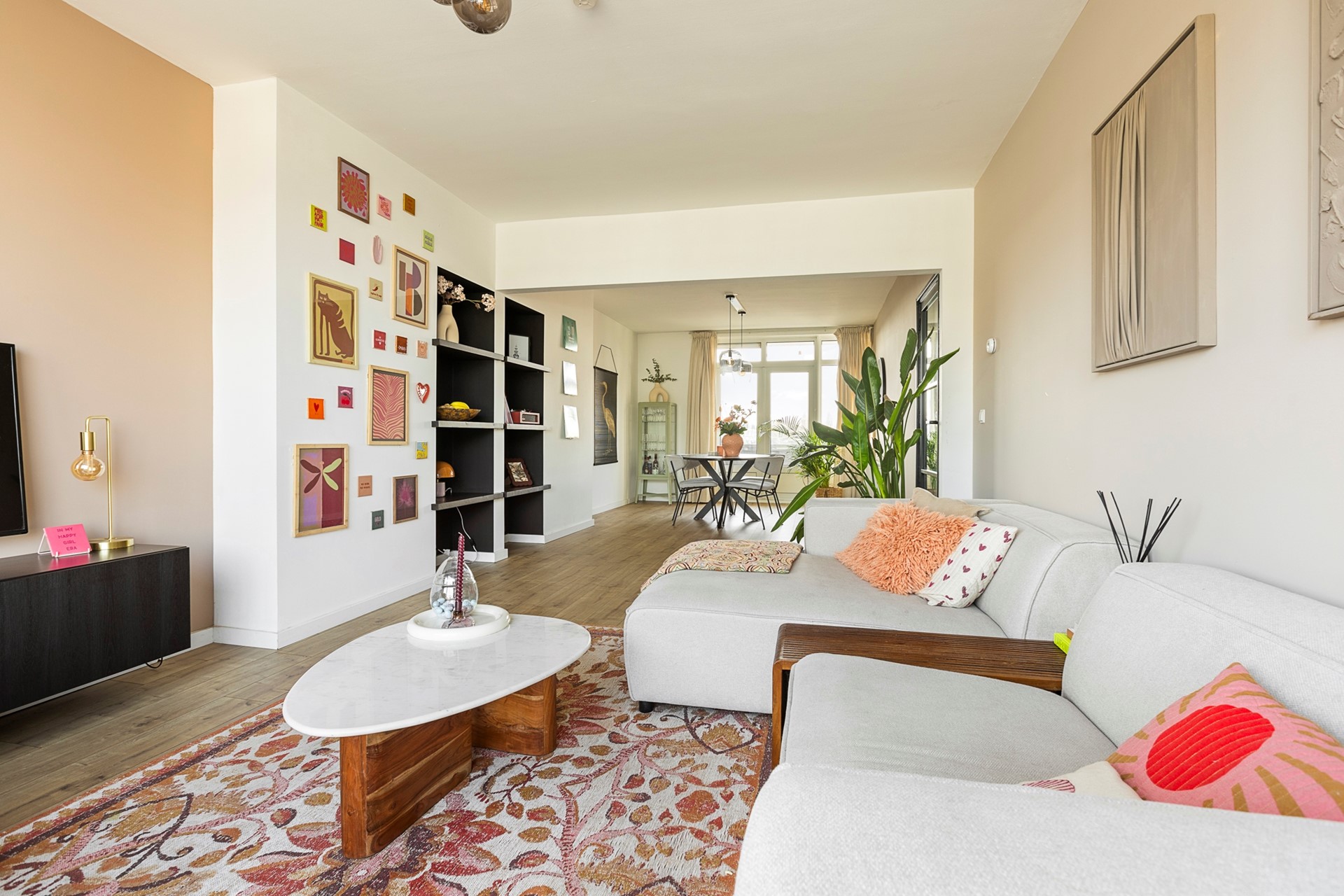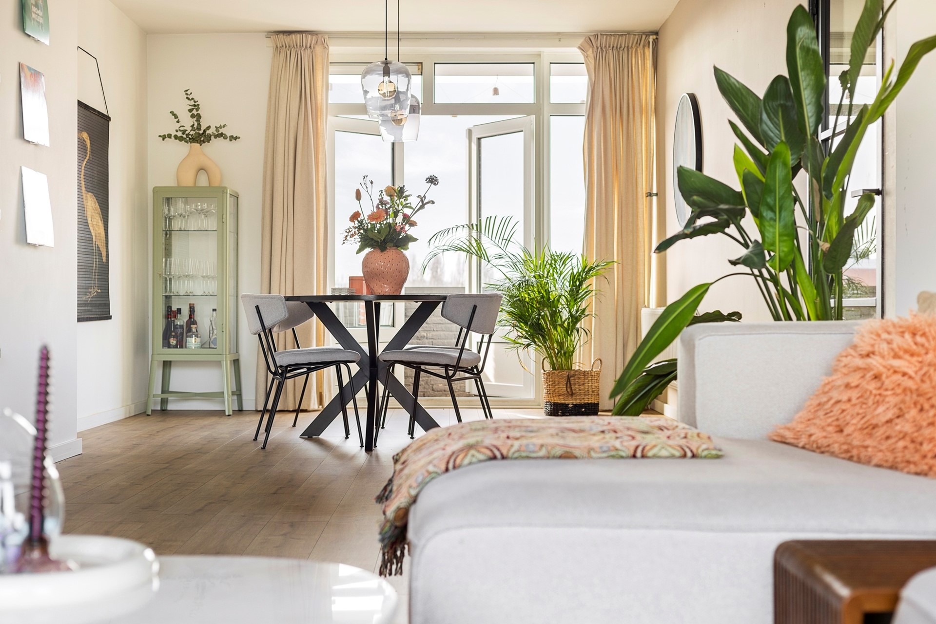 De woning ligt op de tweede verdieping en is via een afgesloten portiek en een trap te bereiken. Bij binnenkomst sta je in de hal, met aan de voorzijde de ruime, lichte woonkamer met eethoek van circa 35 m² groot. Vanuit de woonkamer is het balkon dat over de volledige breedte van de woning loopt, middels openslaande deuren te bereiken.
