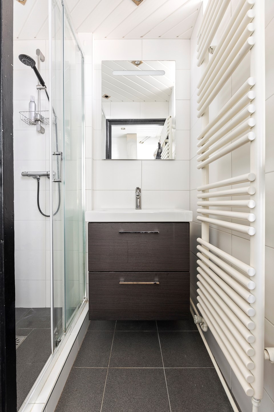 De badkamer is netjes afgewerkt en uitgerust met een douche, wastafelmeubel en designradiator. Het toilet bevindt zich in een aparte ruimte en is vanuit de hal bereikbaar.