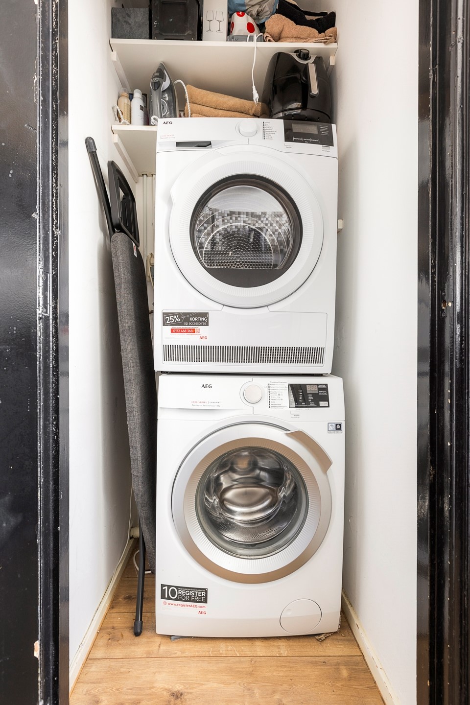De keuken is voorzien van diverse inbouwapparatuur, waaronder een koelkast met vriezer, combimagnetron, vaatwasser (2021) en een inductiekookplaat (2021). Daarnaast is er een ruime inbouwkast met de aansluitingen voor de wasmachine en ruimte voor een droger.