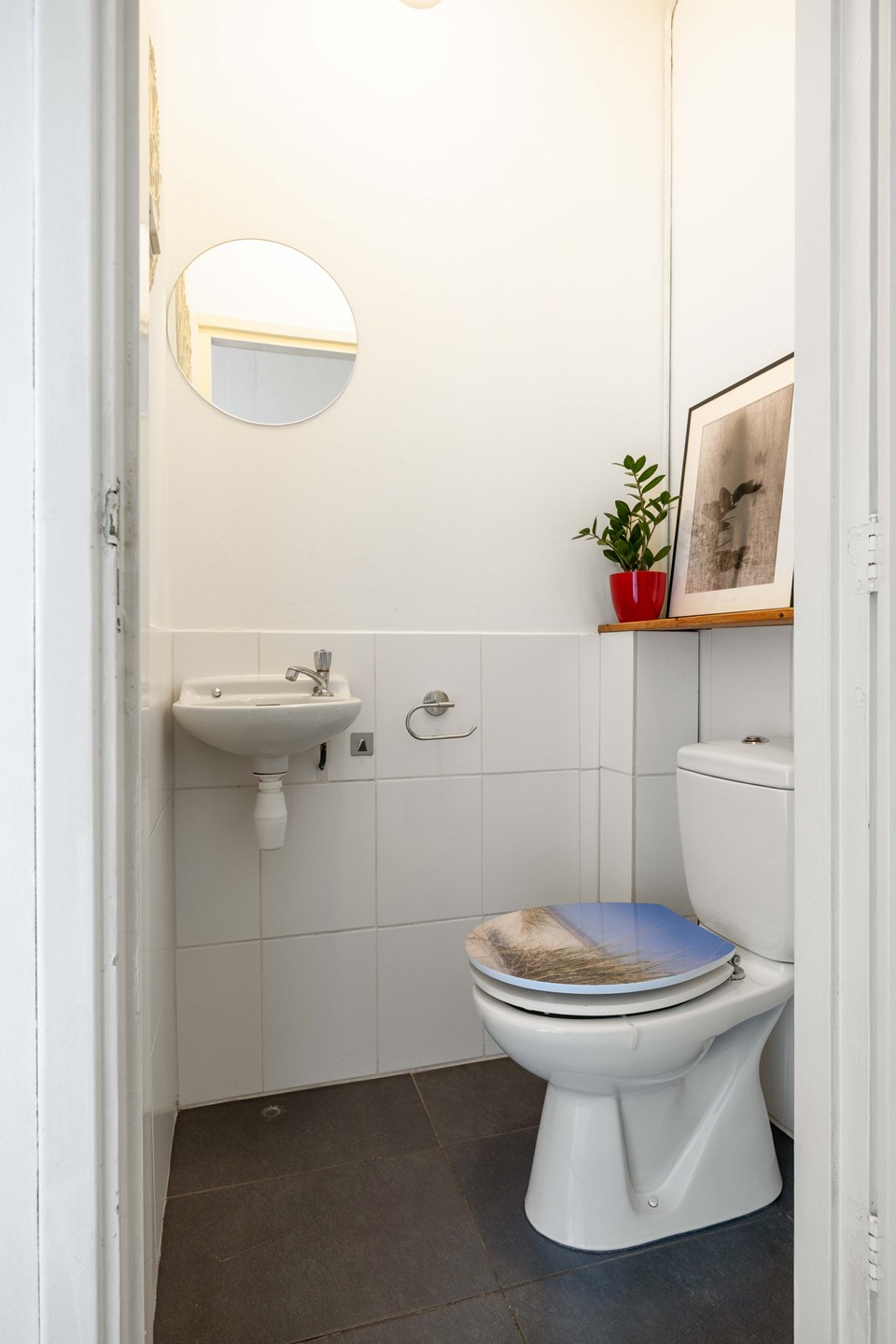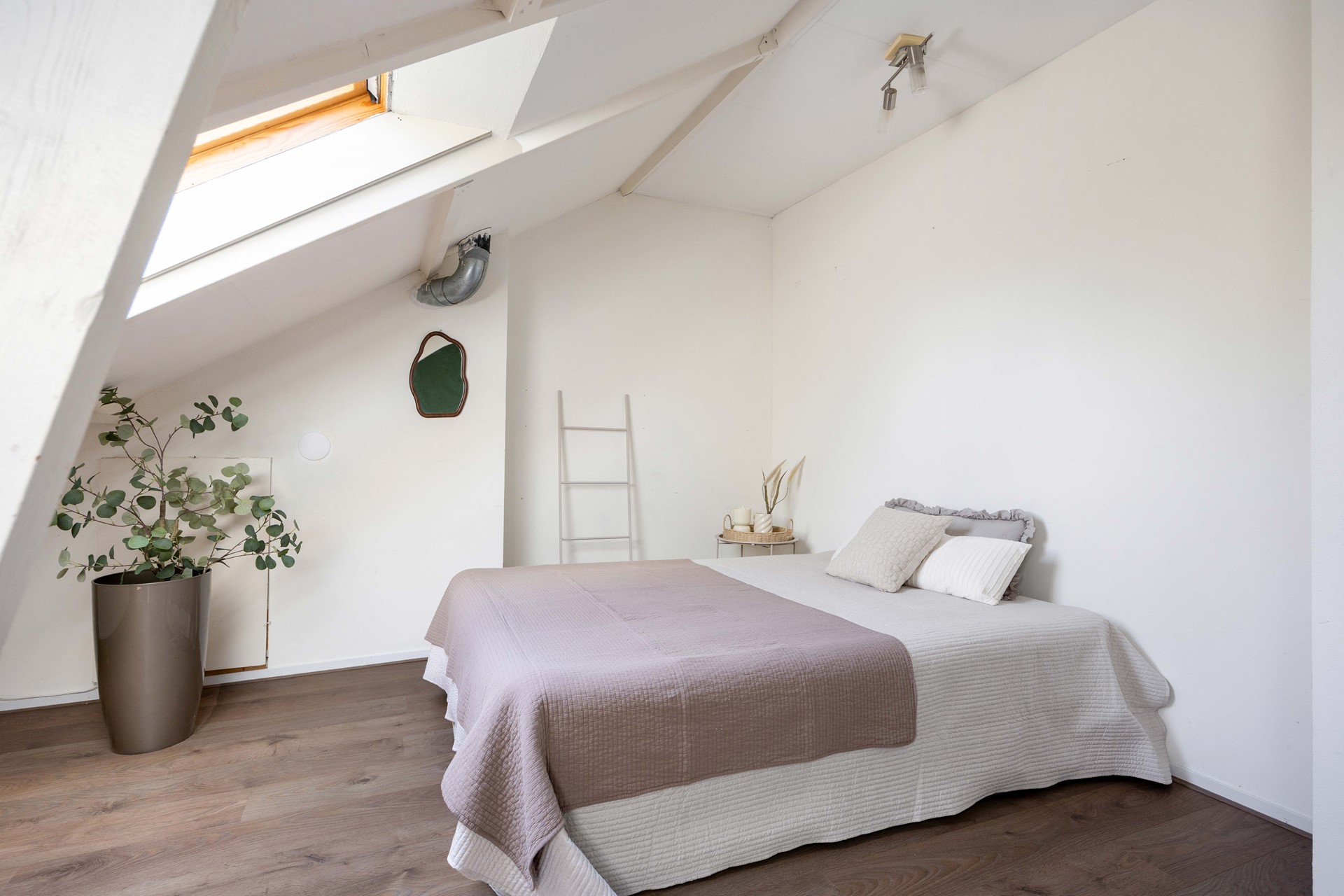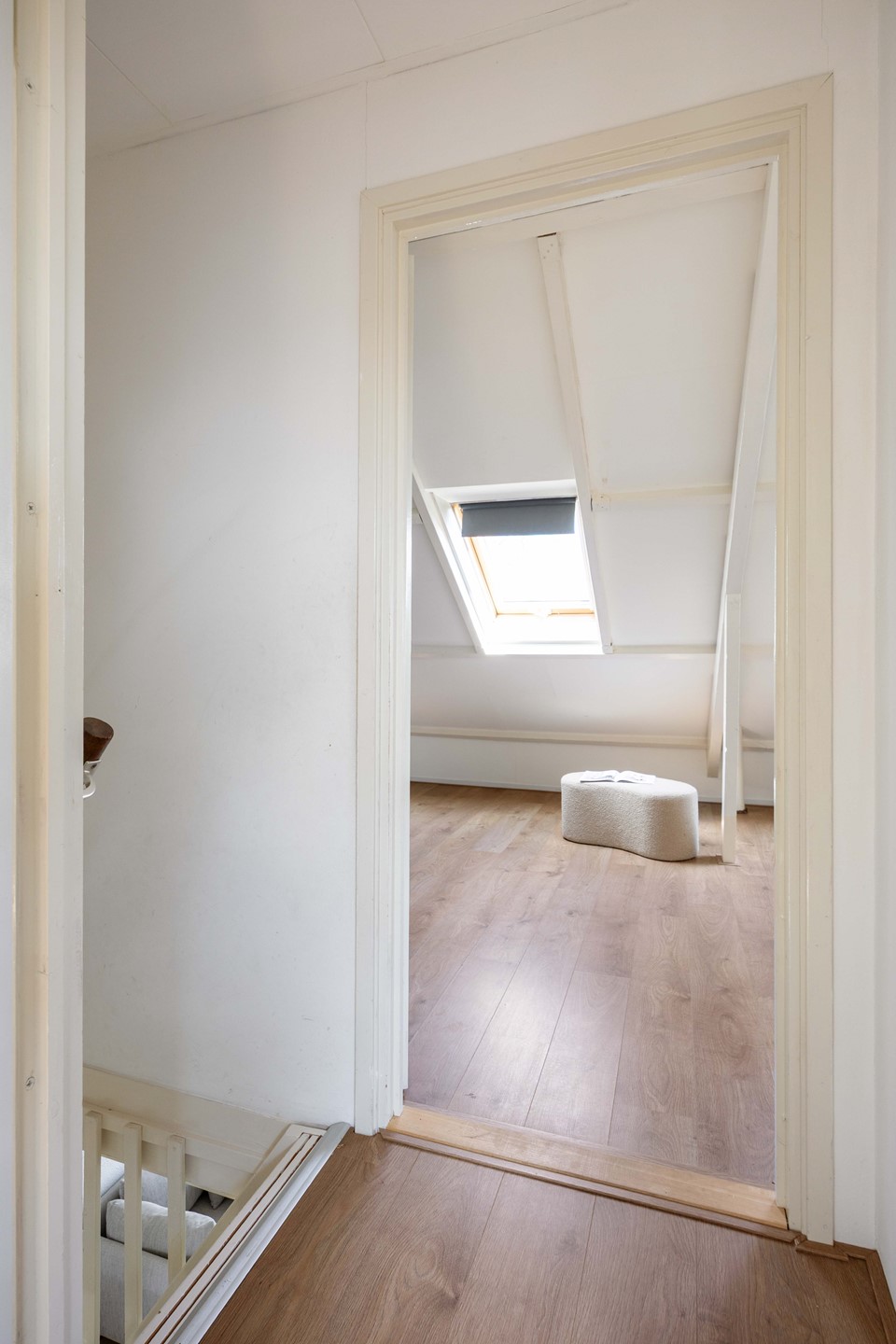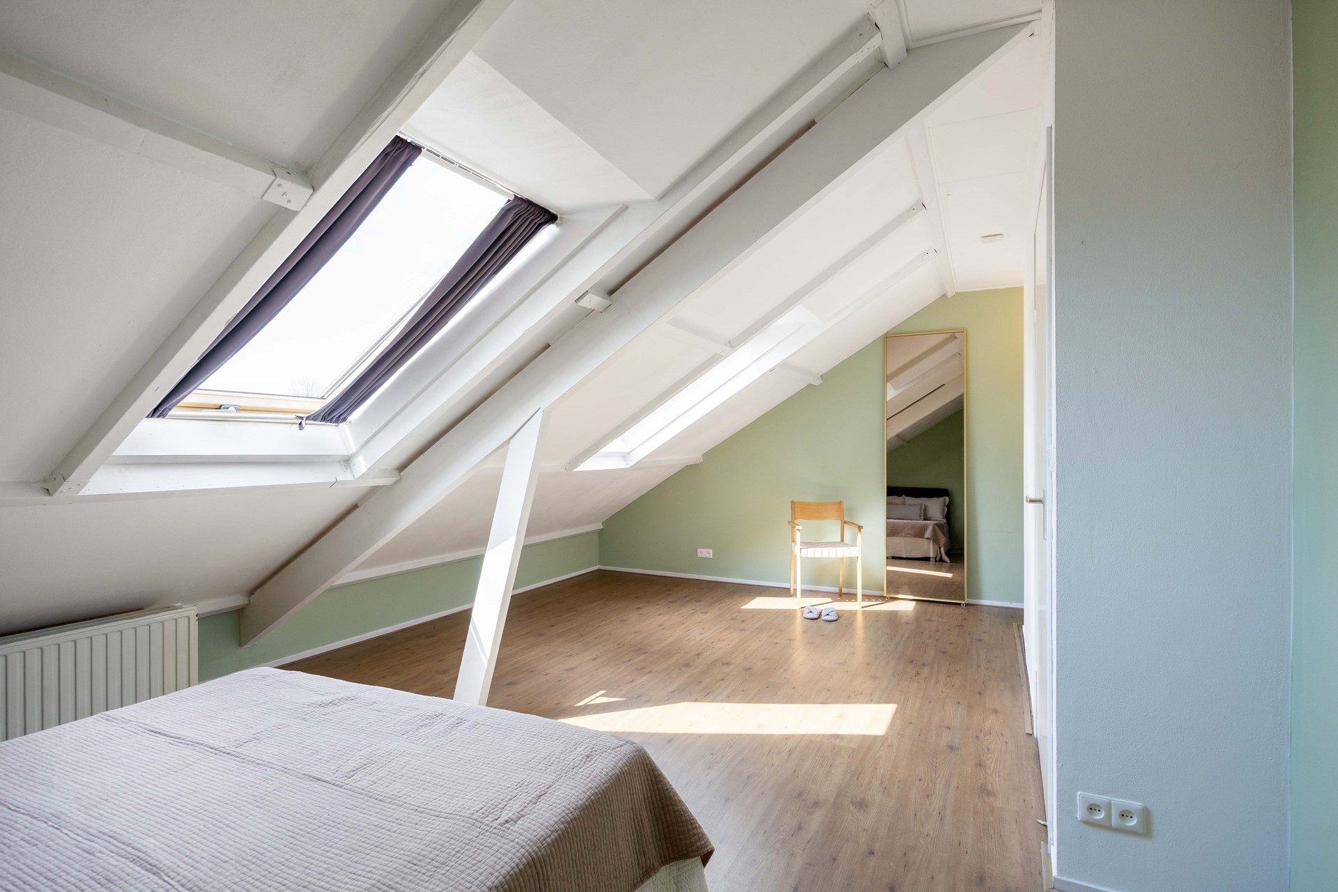 Terug in de hal vind je het toilet en nóg een slaap-/eetkamer van ongeveer 10 m². Vanuit deze kamer heb je toegang tot het tweede balkon op het zuidwesten, waar je ’s middags en ’s avonds heerlijk in de zon zit. Via een trap in de woonkamer kom je op de bovenverdieping. Daar zijn nog twee ruime slaapkamers van circa 15 en 16 m².