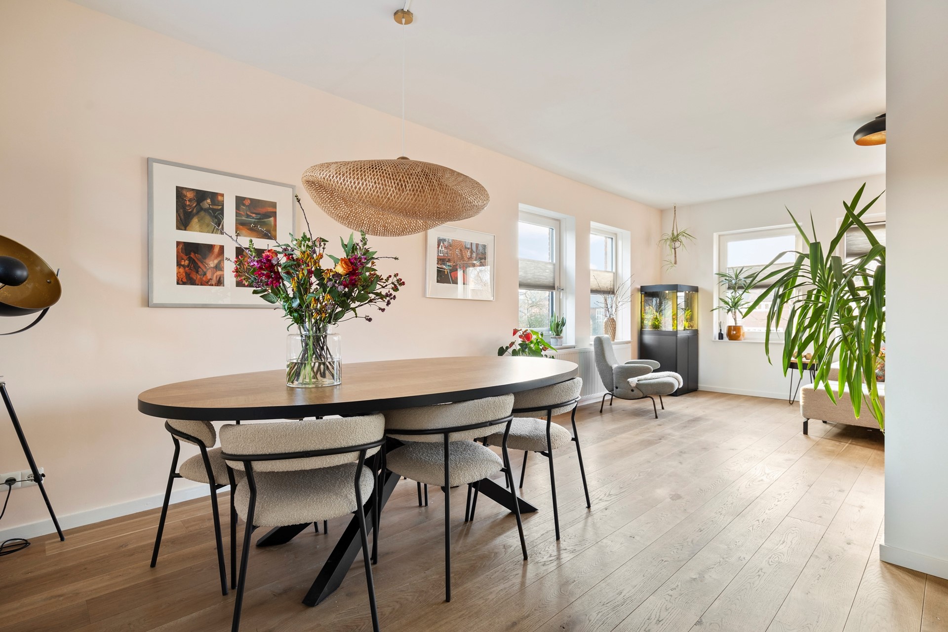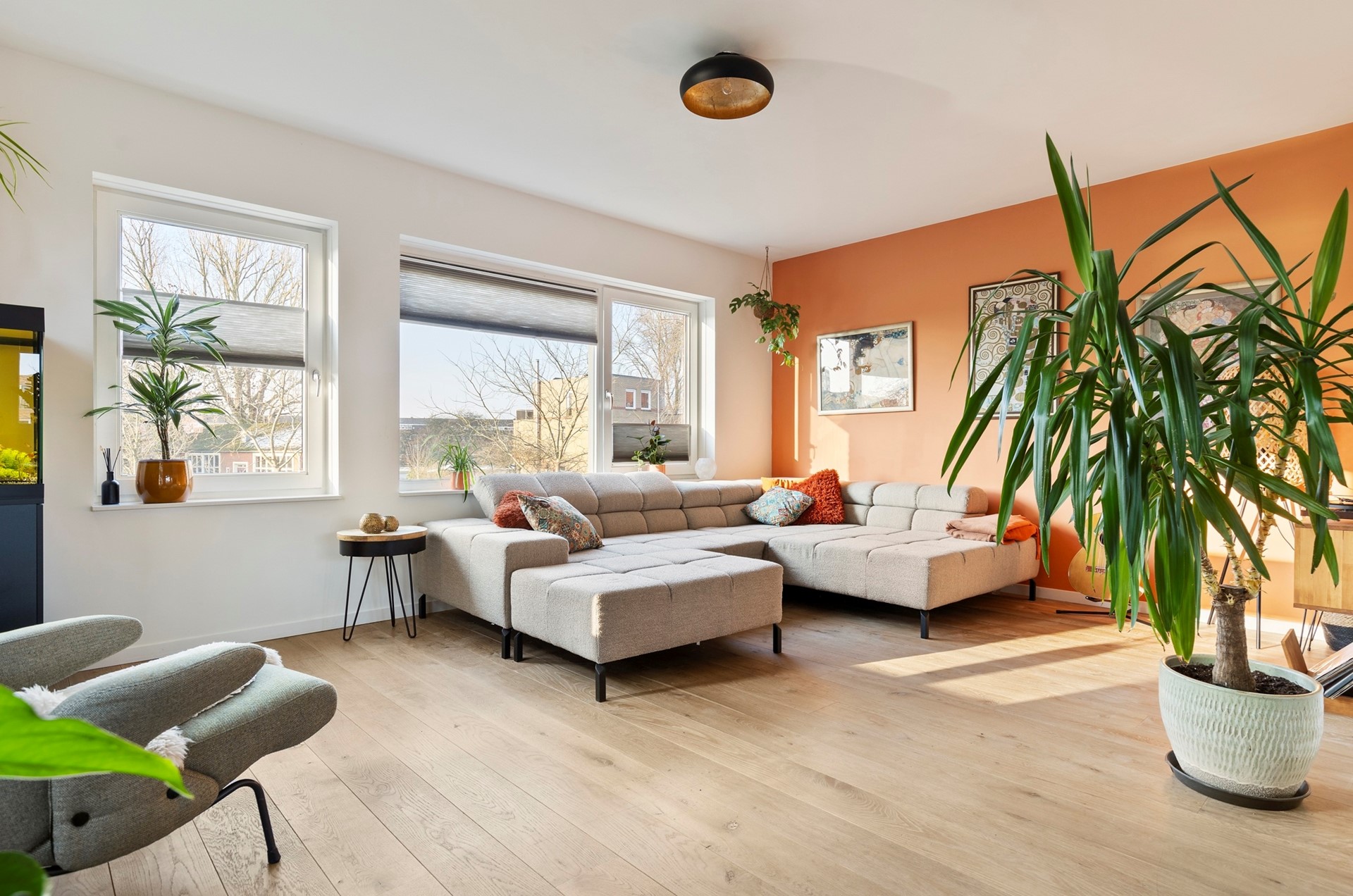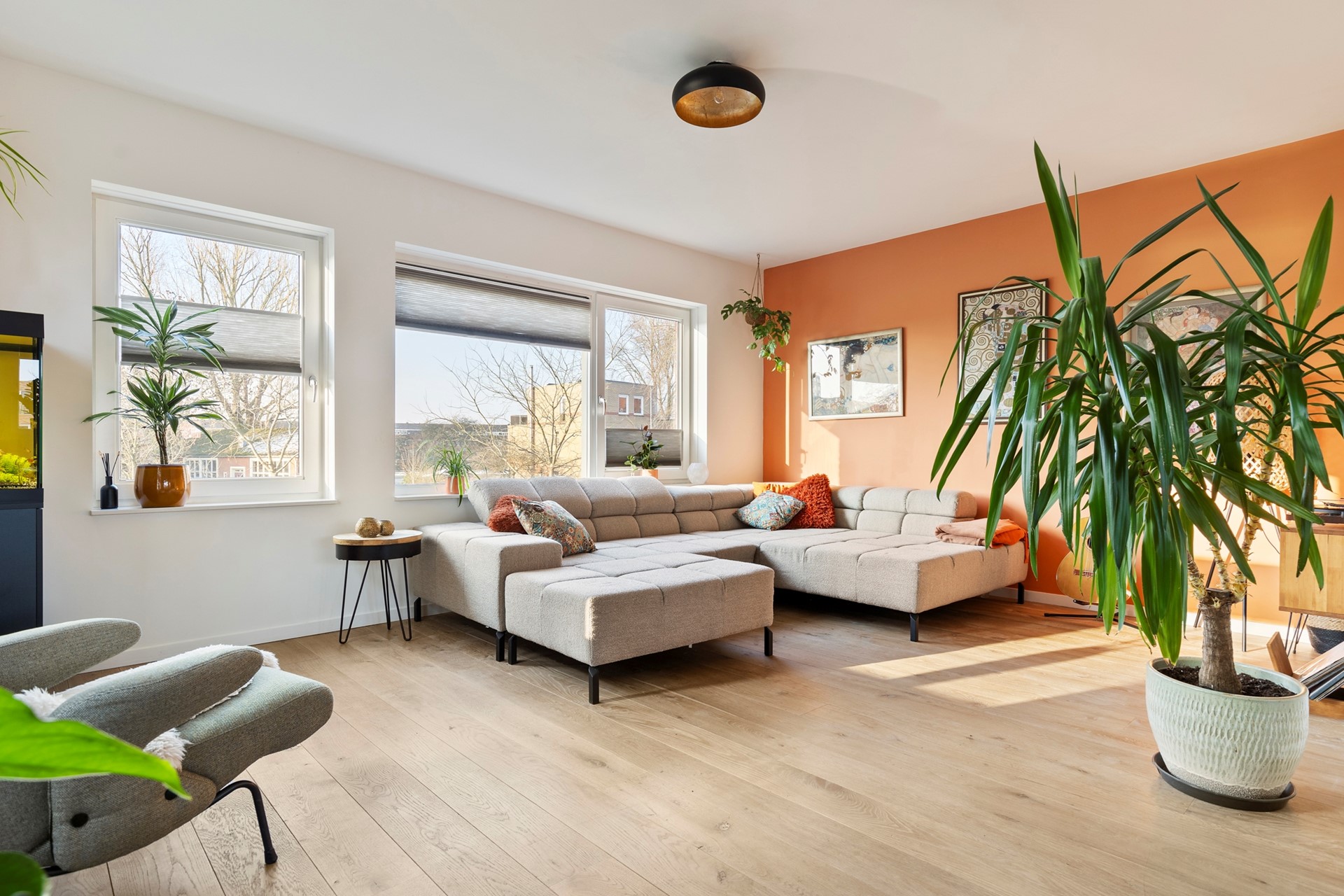 Op de eerste verdieping bevindt zich het leefgedeelte. Hier vind je de ruime woonkamer met open keuken en eetgedeelte van circa 44 m². Vanuit de woonkamer heb je uitzicht over het parkje aan de achterzijde. Door de hoekligging komt er extra veel licht binnen. Deze verdieping is eveneens voorzien van een houten vloer. De keuken is uitgerust met diverse inbouwapparatuur, waaronder een vaatwasser, koelkast, oven, gaskookplaat en afzuigkap.