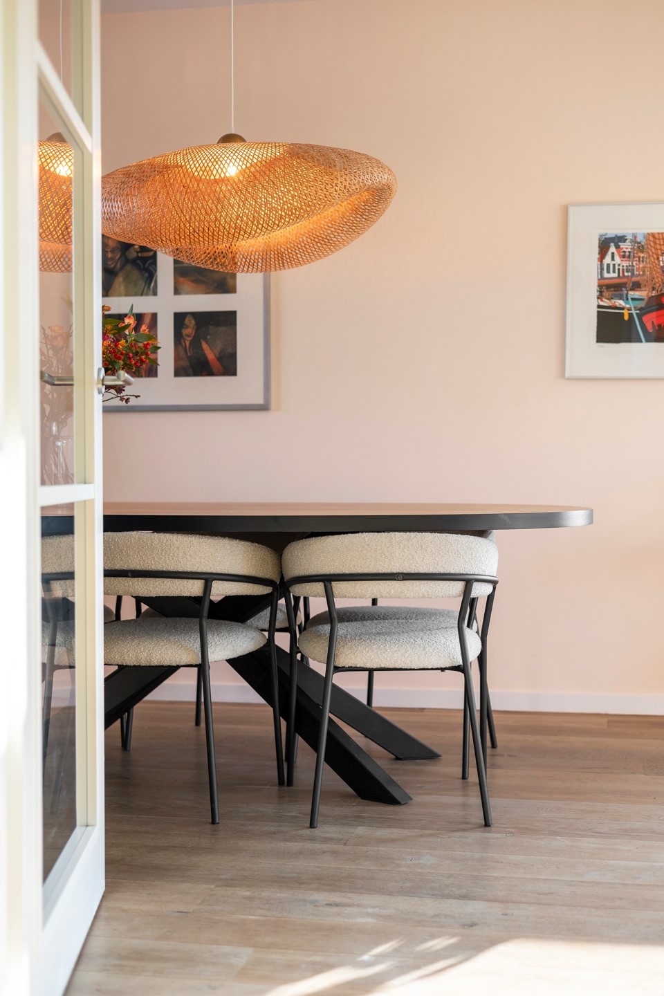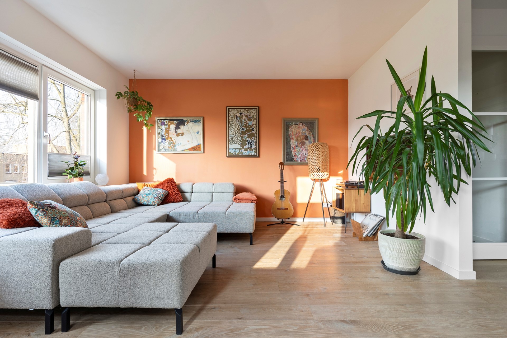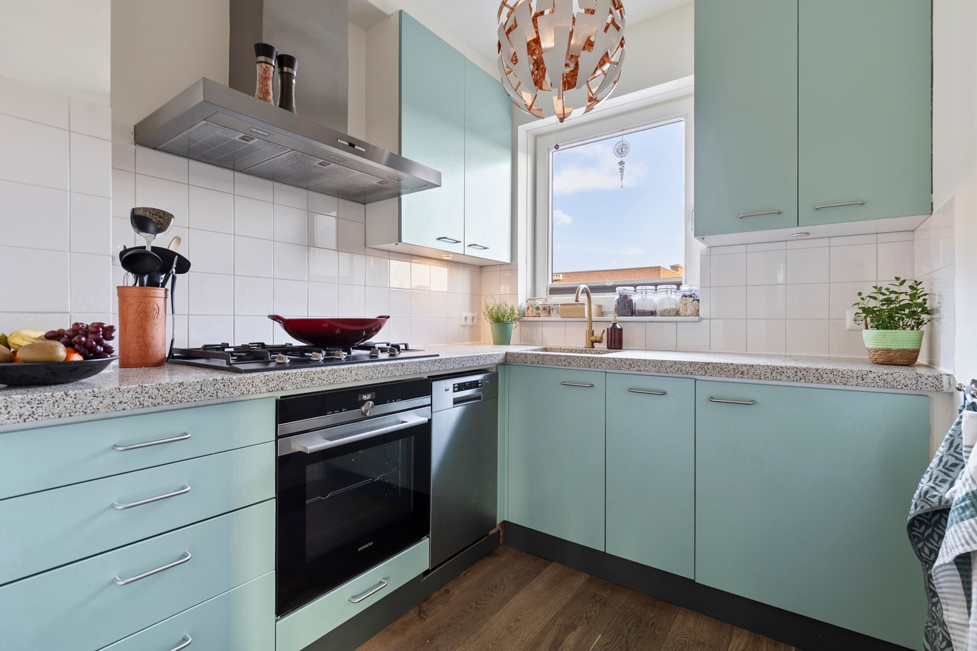 Op de eerste verdieping bevindt zich het leefgedeelte. Hier vind je de ruime woonkamer met open keuken en eetgedeelte van circa 44 m². Vanuit de woonkamer heb je uitzicht over het parkje aan de achterzijde. Door de hoekligging komt er extra veel licht binnen. Deze verdieping is eveneens voorzien van een houten vloer. De keuken is uitgerust met diverse inbouwapparatuur, waaronder een vaatwasser, koelkast, oven, gaskookplaat en afzuigkap.