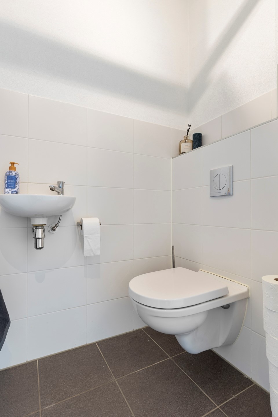 Vanaf de rustige straat bereik je de eigen oprit. Via de bijkeuken of de voordeur kom je de woning binnen. Hier bevindt zich de hal met toilet en meterkast. Op deze verdieping is ook de eerste slaapkamer gesitueerd. Dit is een ruime kamer van circa 20 m², voorzien van een inbouwkast met wastafelmeubel. De slaapkamer beschikt over een mooie houten vloer en een grote schuifpui naar het terras aan de achterzijde van de woning. Deze ruimte kan tevens als woonkamer worden gebruikt. In de hal bevindt zich daarnaast een handige en ruime trapkast. De trap leidt naar de eerste verdieping.